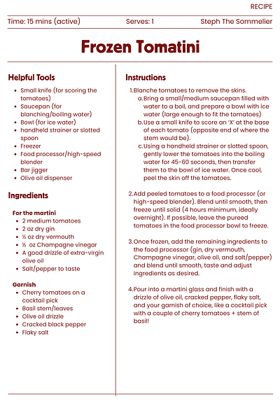The idea for a frozen Tomatini was a product of my inability to read instructions. I recently got a new fridge (for all my content stuff because the hubs couldn’t handle my fridge chaos), and instead of reading the manual to figure out how the temp settings work, I guessed. And set it way too high. This ended up freezing a couple of tomatoes (along with most other things in my fridge, but we won’t get into that), and while some might see a couple of sad tomatoes ready to be tossed, I saw an opportunity. Or should I say — a tomatunity.