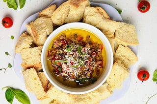 Easy and delicious Italian dipping oil meets a savoury tomato spritz for the ultimate tomato girl summer pairing
