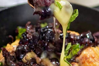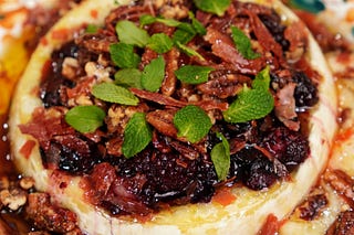 B&B S03 E02! Gooey baked brie with roasted blueberries/blackberries, sweet/salty/slightly spicy candied pecans, the cripsiest Prosciutto, fresh mint…